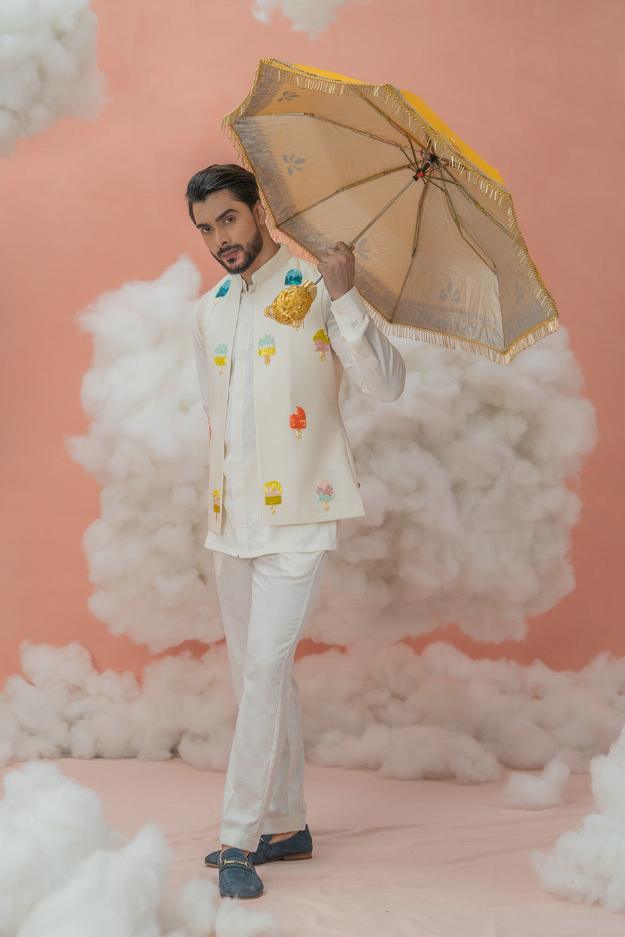 This Ivory linen shirt paired with monochrome pants is the calm before a color storm. Paired with our lively and colorful Ice candy Bundi, this set is a thunderstorm for all your occasions. The contemporary motifs gives  the outfit and you  an edge over everyone else.