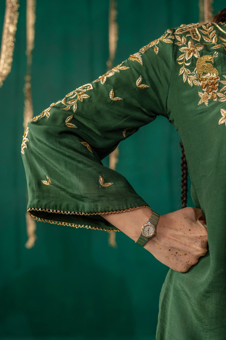 A sleek green straight-cut kurta in luxurious linen satin, adorned with exquisite embroidery in gold and champagne zari threads, accented with maroon, yellow, and fabric detailing. Paired with elegant crepe sharara pants, this ensemble is complemented by a green organza dupatta, featuring intricate green zari appliqués and delicate motif embellishments along the border for a refined and graceful finish.