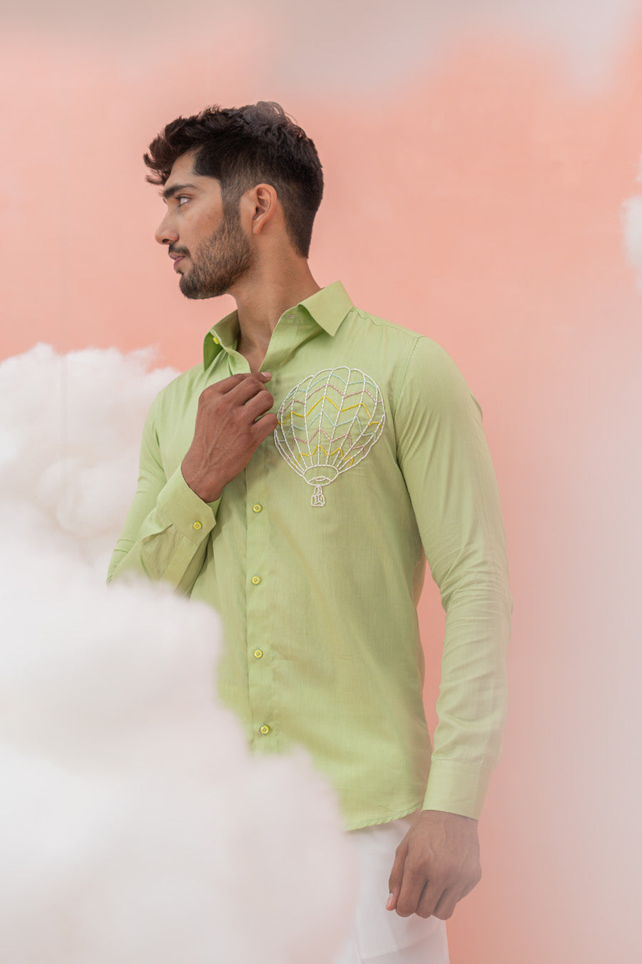 A  Light Green Vegan Silk shirt, meticulously hand-embroidered with cut pipes in white, blue, pink, and yellow, forming a vibrant hot air balloon. This design captures the fresh and exhilarating vibes of summer, blending formal elegance with a playful after-party spirit. Perfect for those who want to infuse their wardrobe with a touch of adventure while maintaining a polished look.