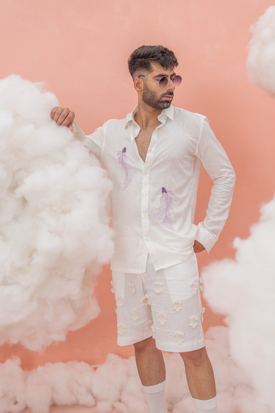 Immerse yourself in tranquility with this white Linen Cotton full sleeved shirt, rendered in elegant purple beads and silk thread in the crafty LineArt. The graceful movement of Koi symbolizes embracing peacefulness and cherishing serene summer vibes.