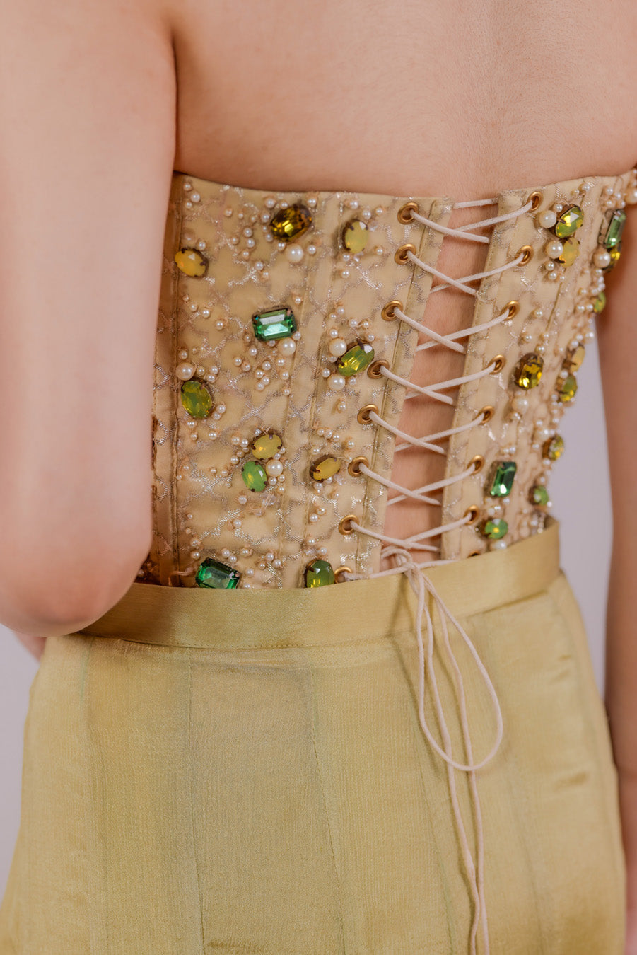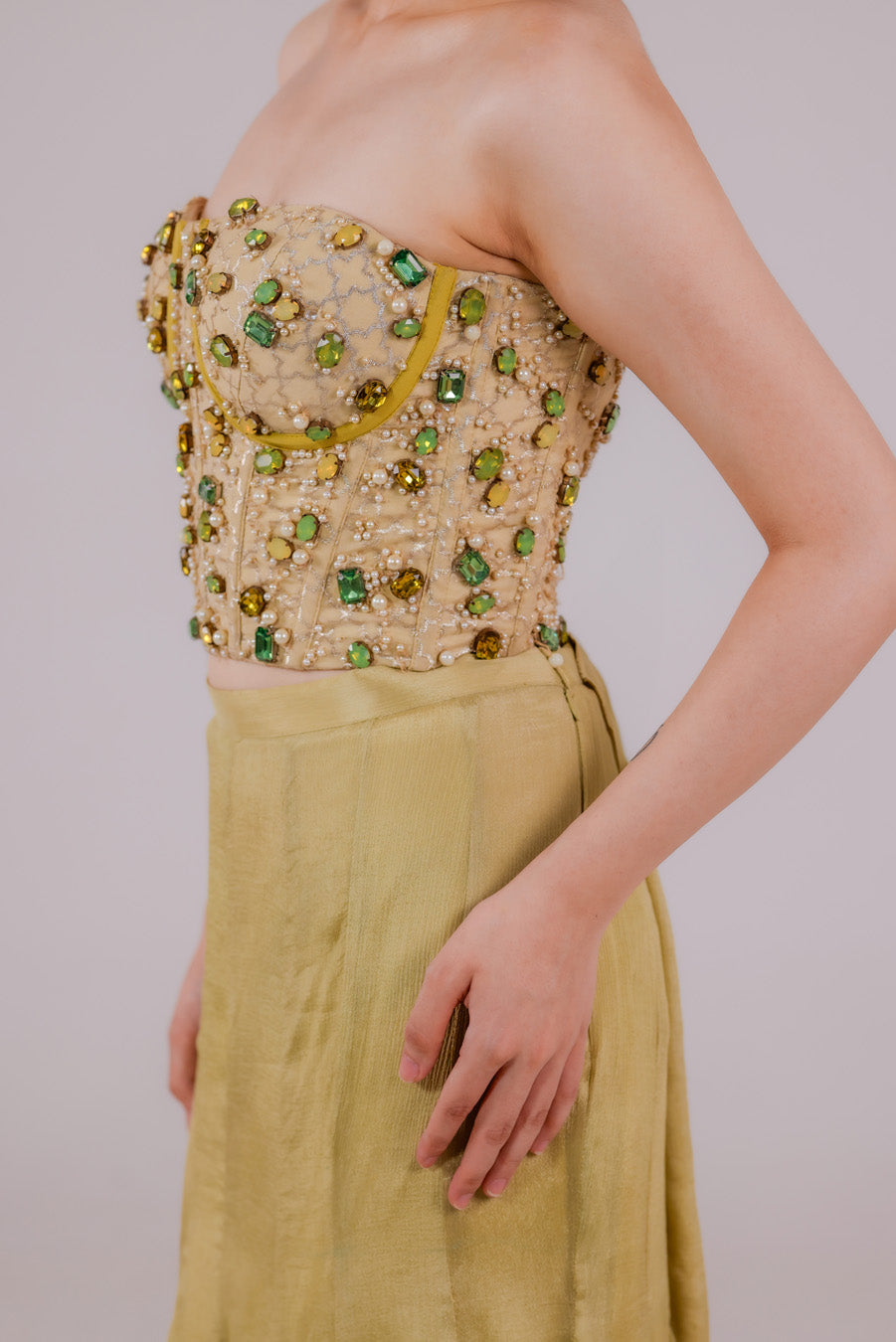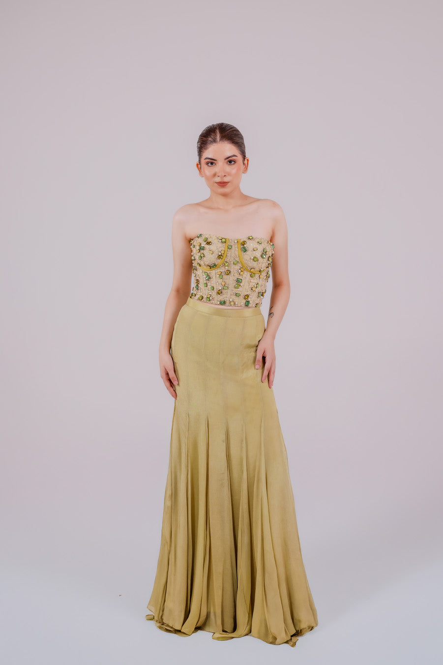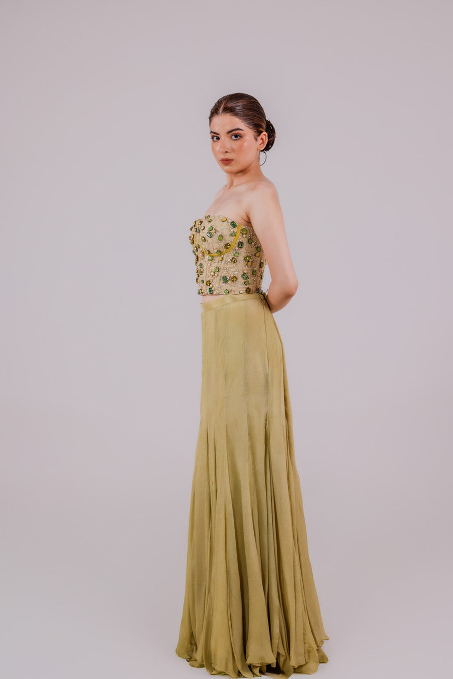 Crafted in luxurious Chanderi weave, this sage green corset features a structured contrast under-bust bone and intricate hand-embellished crystal studs and pearls. The criss-cross back opening adds a rebellious charm, while the chiffon-draped fish-cut skirt creates movement and grace. A statement of modern elegance fused with traditional craftsmanship.