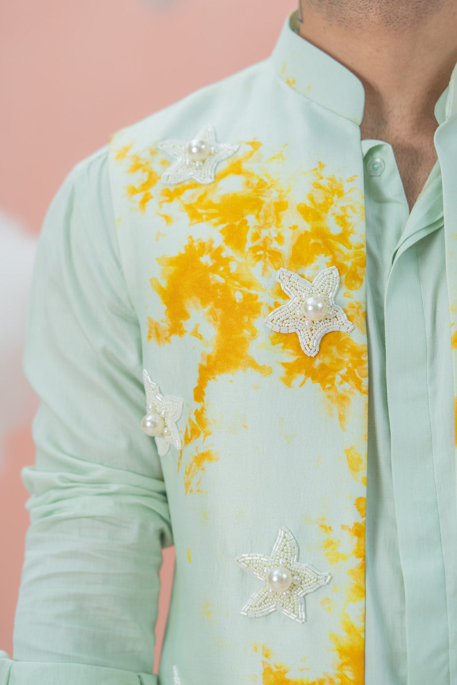 Going to the beach? Our chanderi bundi with a mix of tie and dye and starfish inspired embroidery is exemplary for a modern and beachy look. The contrast between yellow and blue creates and popping and eye catching look.
