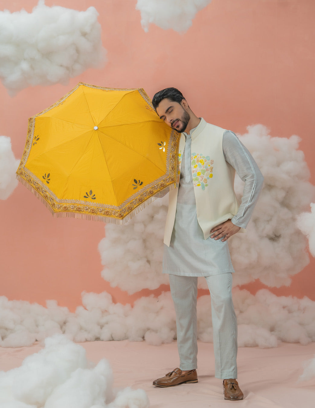 This silk long kurta set brings a sense of calm and tranquility . Paired with vegan silk pant pajamas, this ensemble is a graceful blend of craftsmanship and elegance, perfect for any festive gathering. Enriched with Our Amoeba bundi , this set of 3 is complete in its colors, tailoring, textures and look.