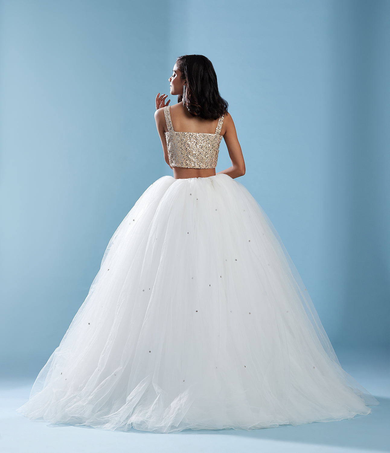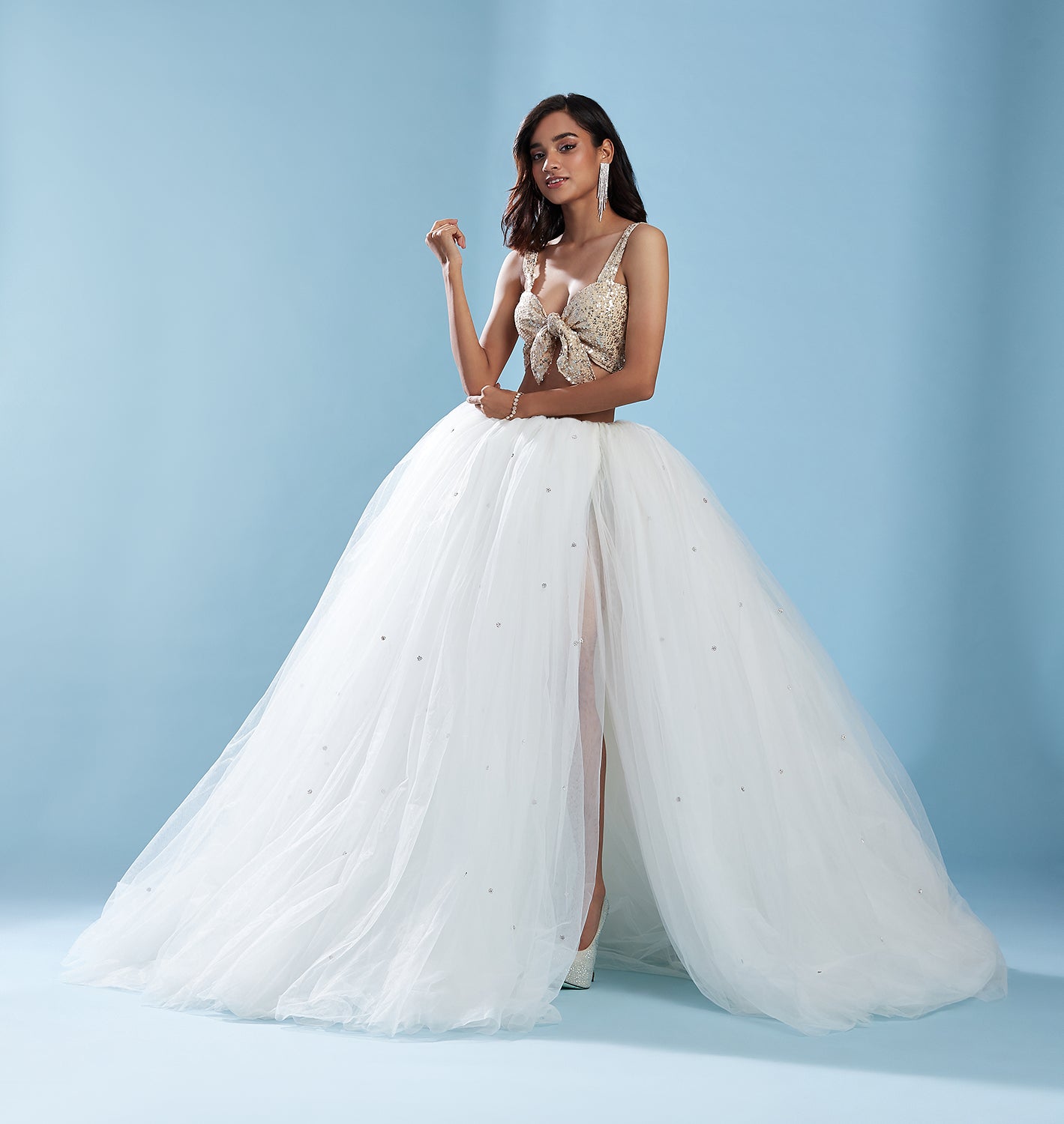 The top features a front tieup top in hand embellished thread and sequin embroideries.  Our Noa lehenga exudes Y2K, glam energy. This pull-on tulle skirt features all-over white, iridescent, and sequin florals that reflect the light creating an almost liquid effect. Carefully handmade with hundreds of layers, this lehenga is designed with a thigh high slit along the front. Shown here in White/Crystal.