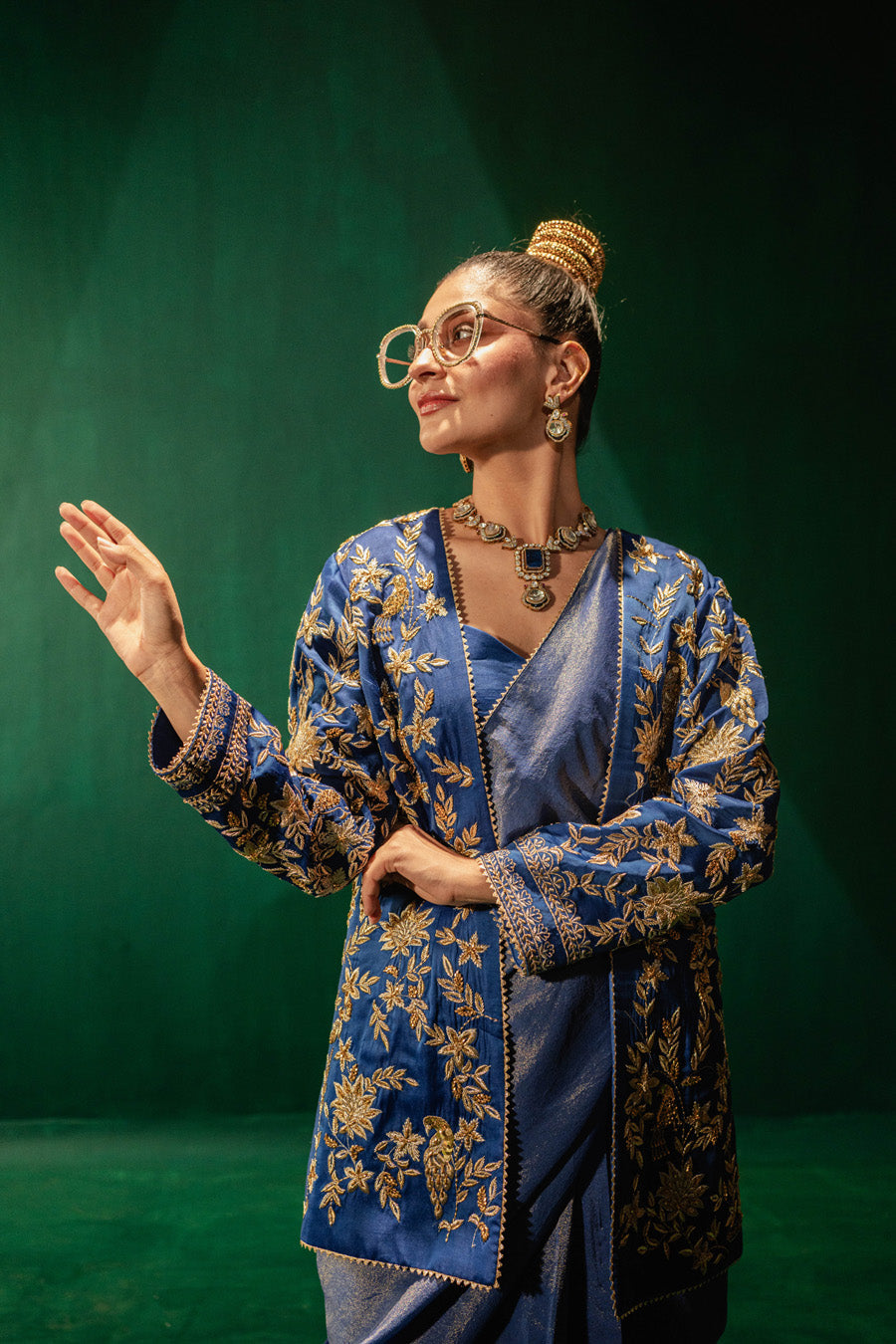 A sophisticated blue crepe blouse paired with a pre-draped blue tissue organza saree, elegantly complemented by a fully embroidered jacket. Adorned with shimmering metal sequins and cut dana work, the jacket features intricate peacock and bird motifs intertwined with delicate floral and leaf designs, adding a touch of opulence and refined elegance to the ensemble.