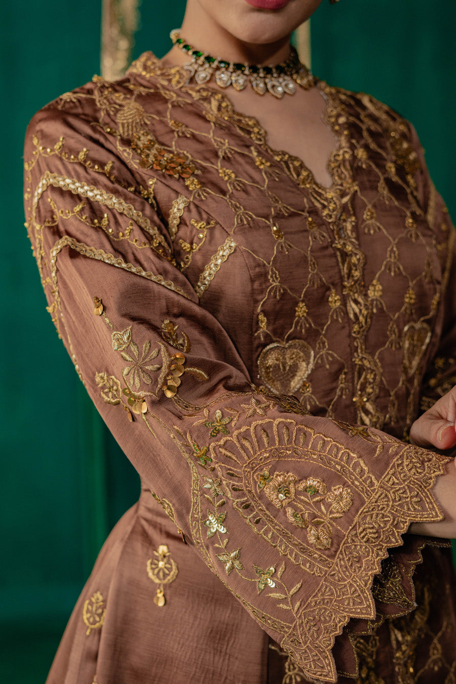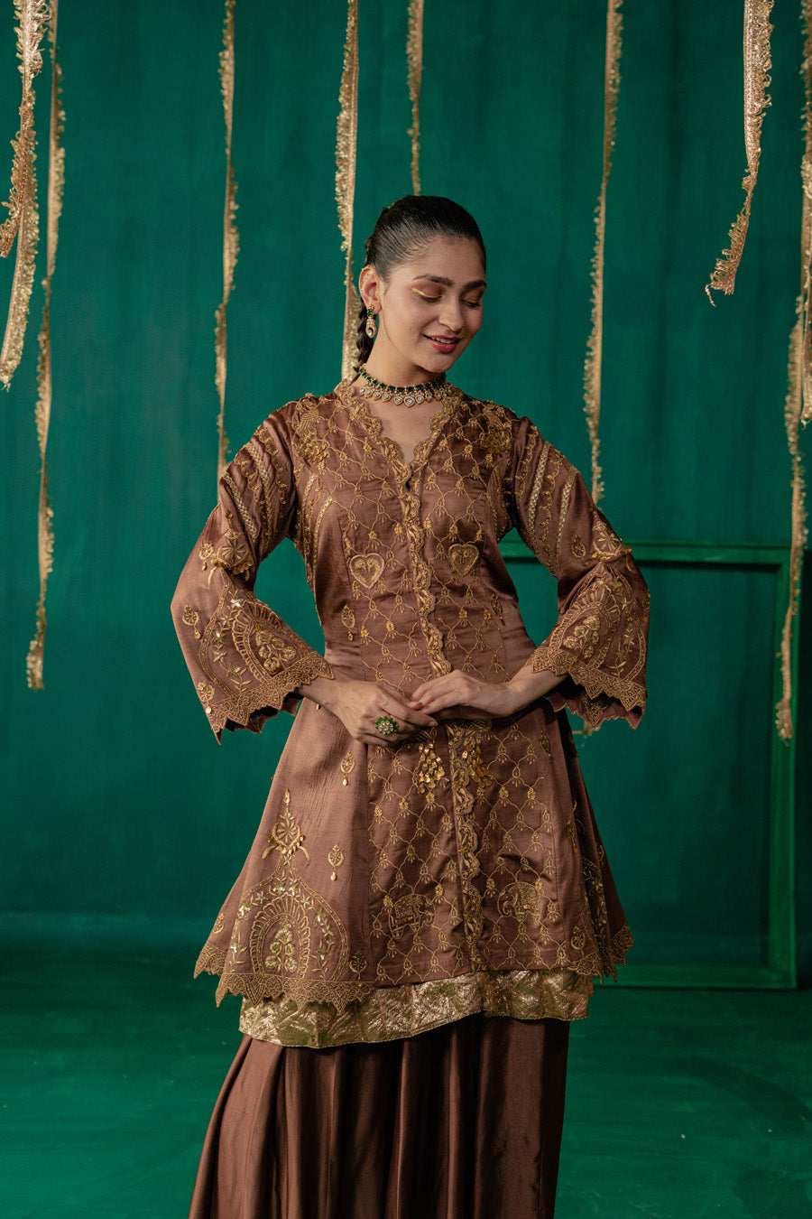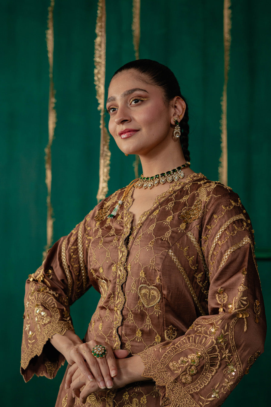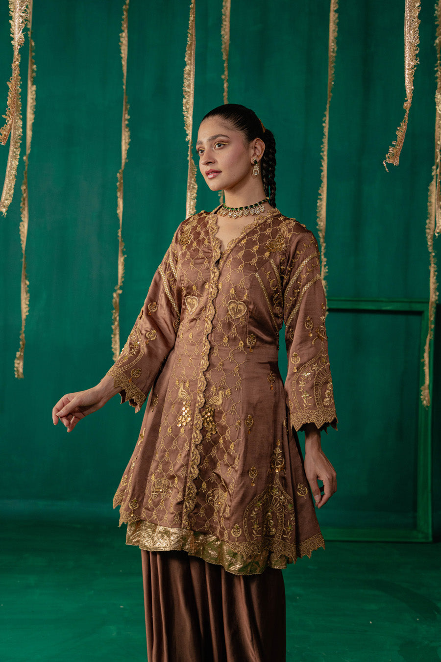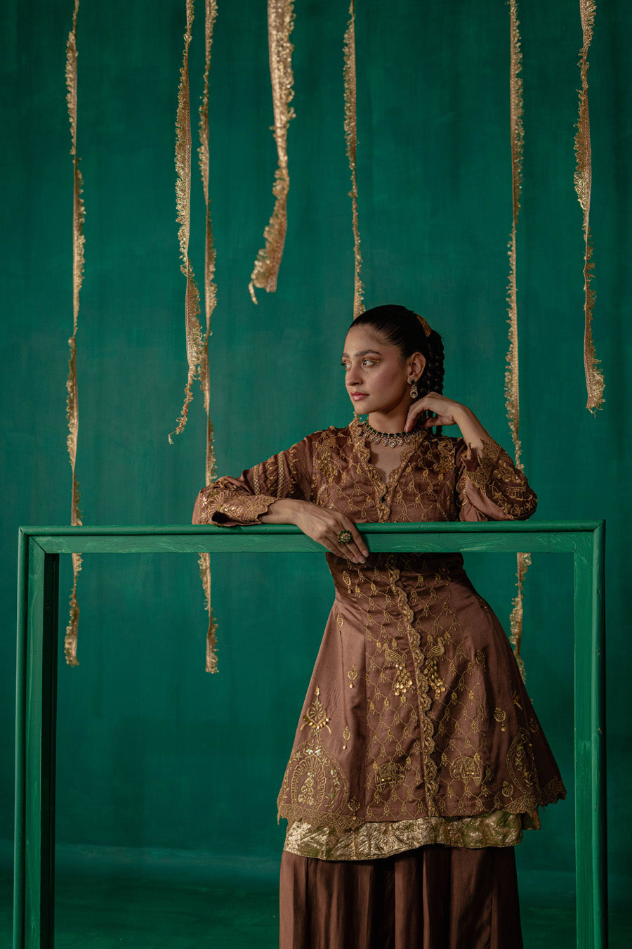 A sophisticated chocolate brown Anarkali jacket paired with wide-leg pants, crafted from luxurious linen satin fabric. The ensemble is elegantly enhanced with authentic dark gold and champagne gold metal detailing, adding a rich, opulent touch for a truly classy and refined look.