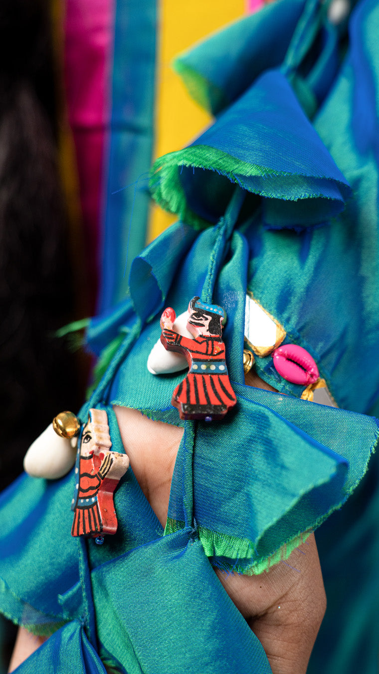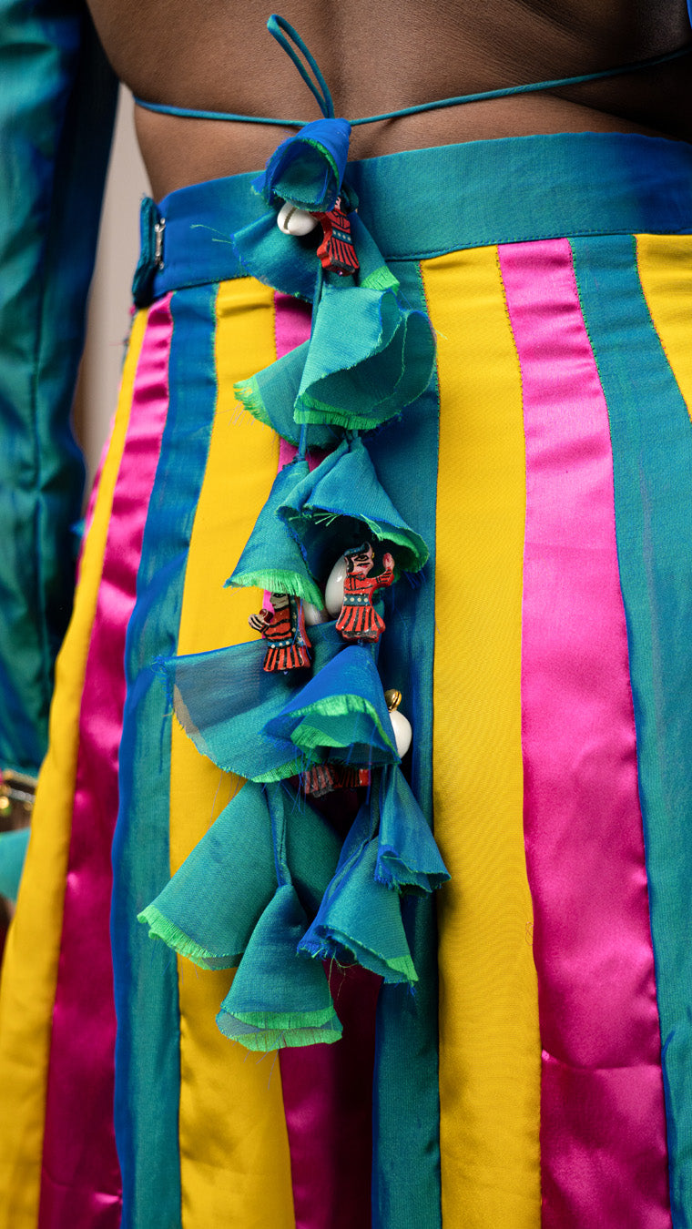 A head turning three piece lehenga set featuring bold vertical stripes in fushsia, teal, mustard, and emerald, this outfit is crafted using traditional chattapatti technique revived with a modern spin. The structured blouse adds fierce energy with a chic V-Cut neckline and fitted sleeves, with cut mirror and ghungroo embroidery work on sleeves while the high slit skirt brings maximum movement and drama with a tassel tied back and draped in a hot pink chiffon dupatta with tassel accents with elements of shells, puppets, ghungroo in the handmade tassel this set is made for dancing under fairy lights owning the festive stage or just being the loudest burst of joy in the room