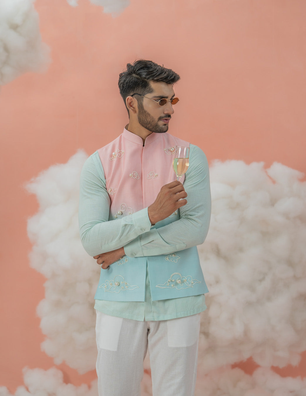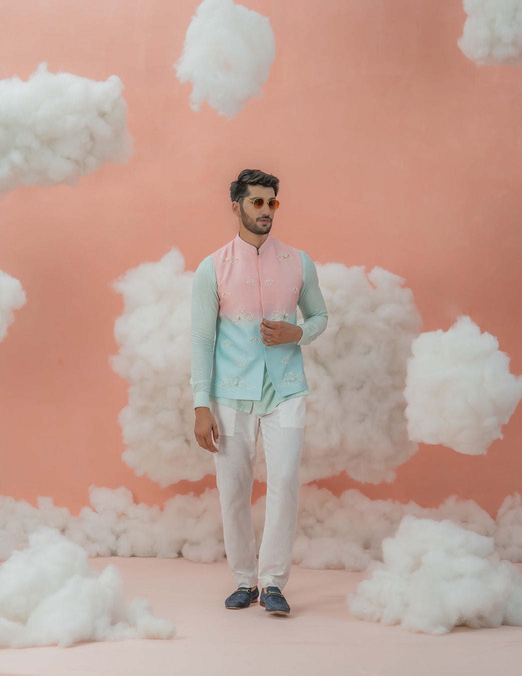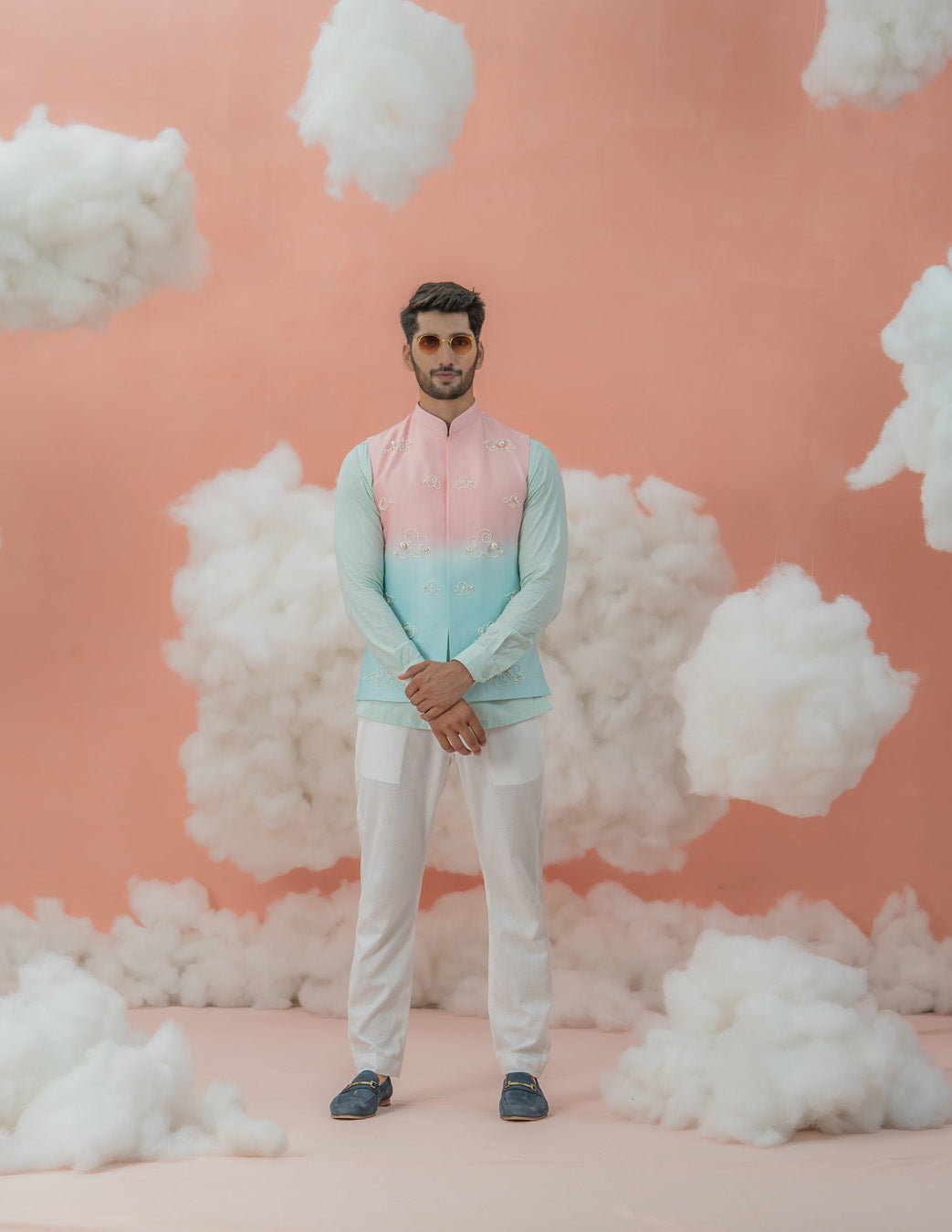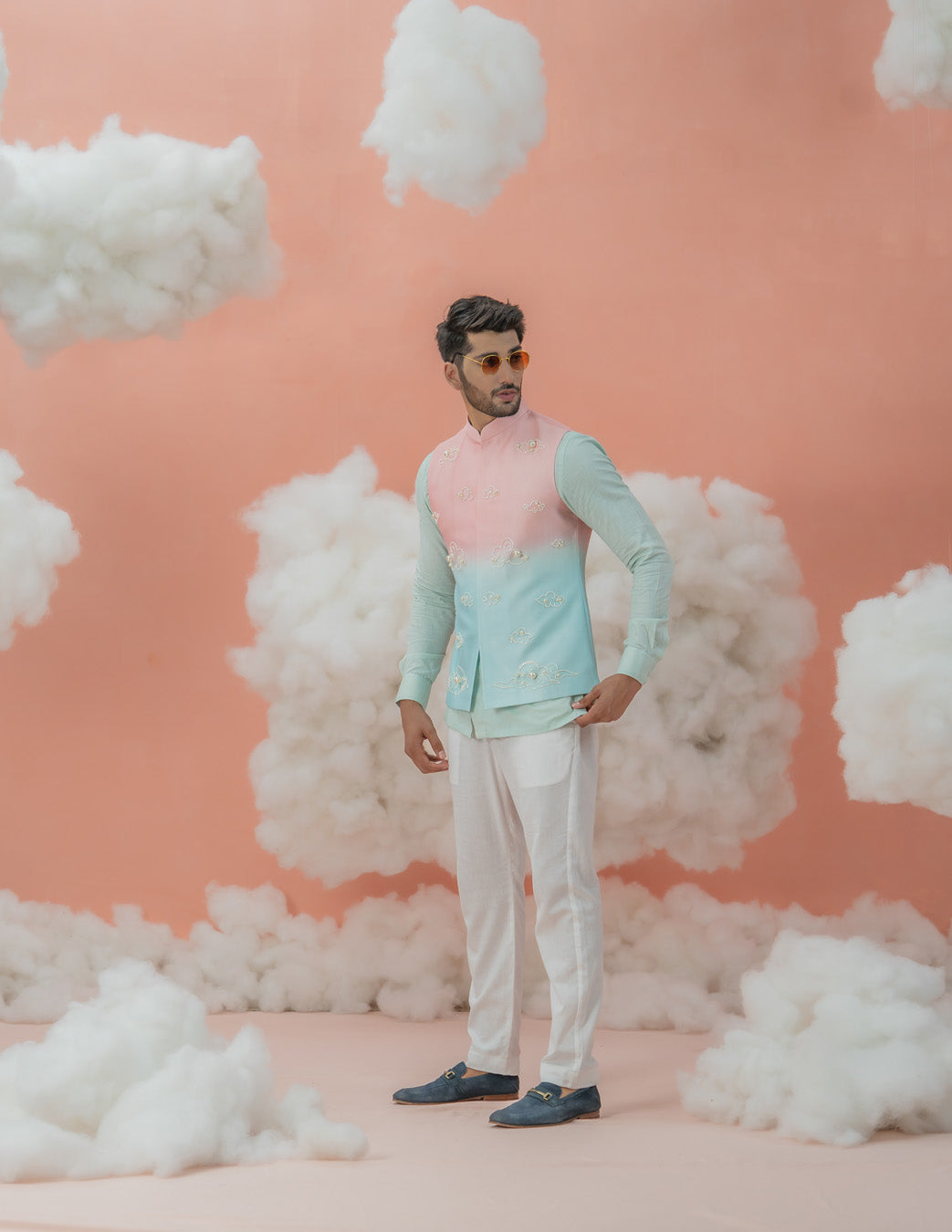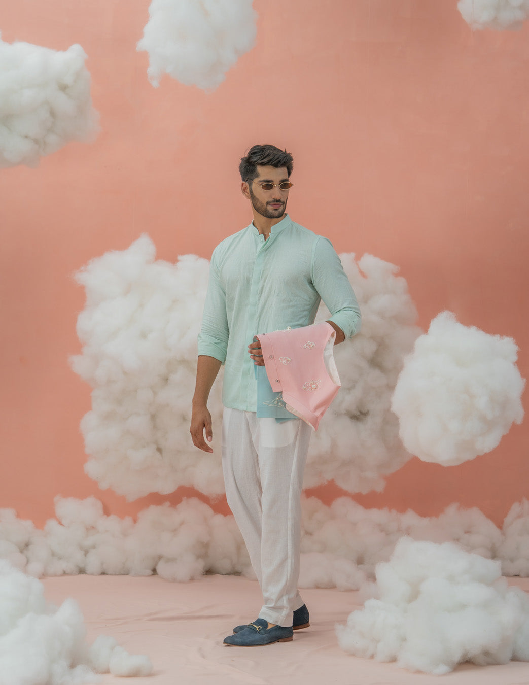 Looking for somethign dreamy for your festivals and occasions? This blue mint shirt with Ivory pants is soothing to the eyes in a soft color palette . Paired with our cloudy themed dual shade disney Bundi transforms this set into a daydream.