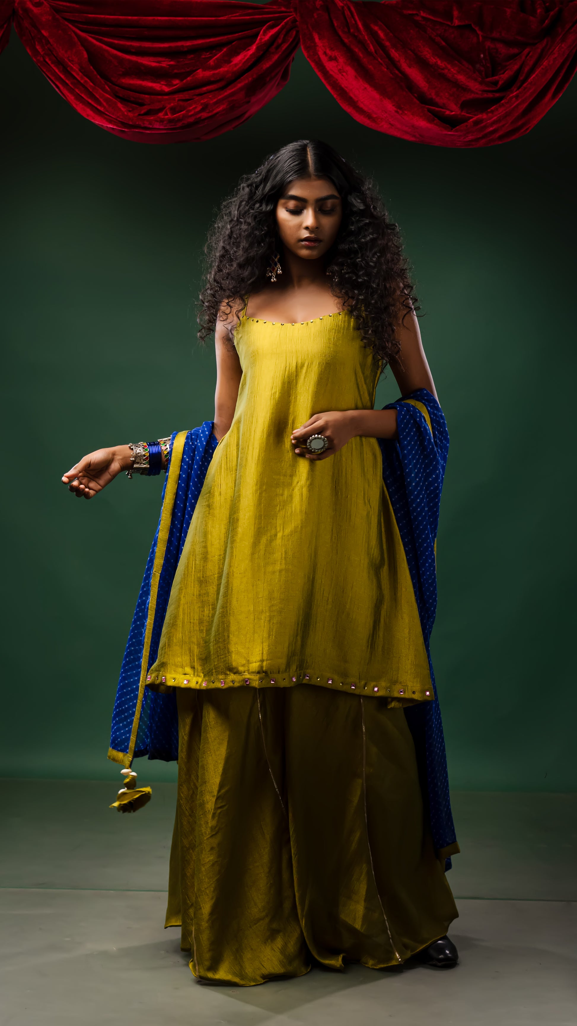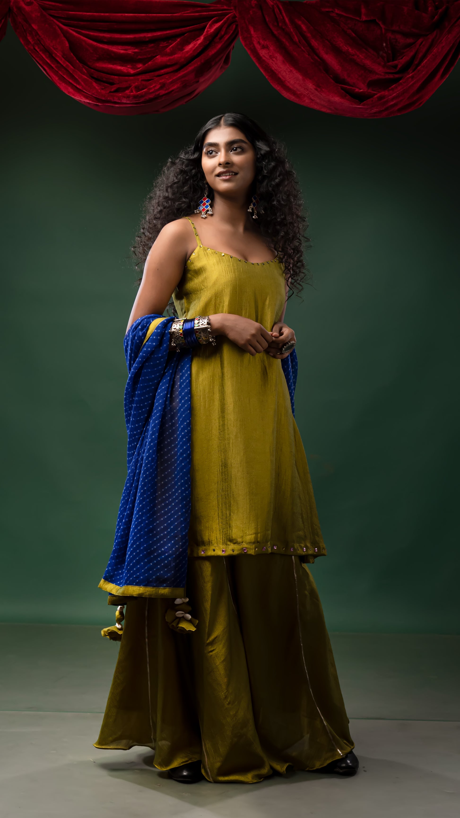 Float into festive soirees with the gentle grace of kaccha Aam Gola, Hand- Crafted in a rich mossy olive hue, This three piece set features a breezy A-Line kurta with delicate bead and sequence work that subtly catches the light paired with wide flared gharara pants on Gota Patti work and leheriya dupatta with handmade tassel, This look celebrates understated elegance and earthy charm