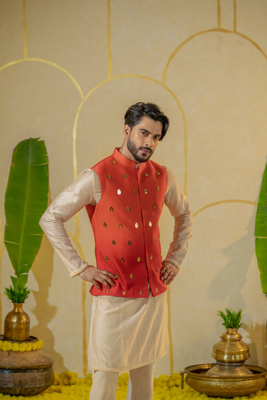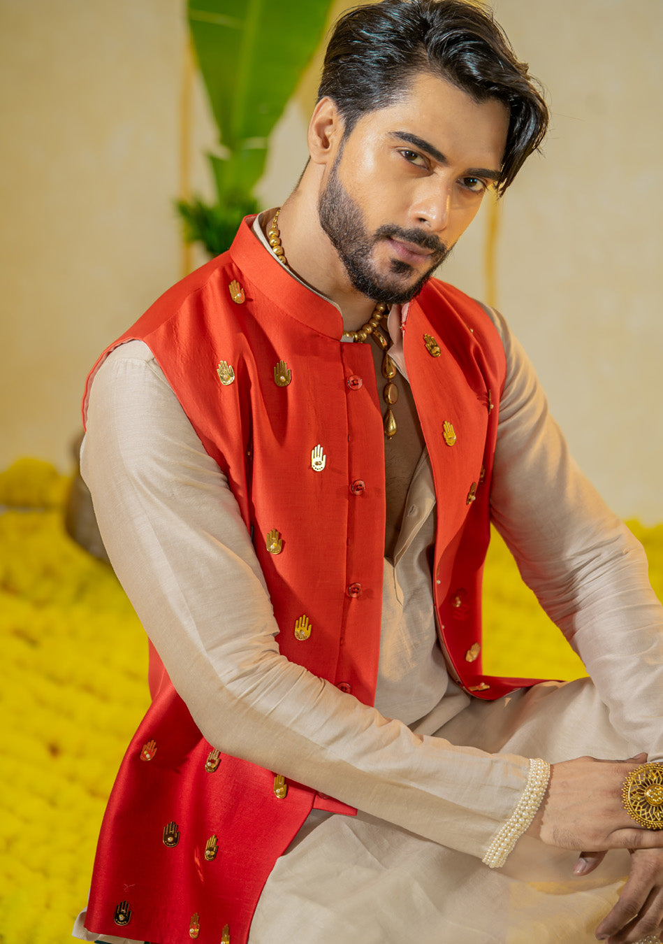 The shaded Chanderi bundi captures the essence of an Indian tradition- Mauli Dhaaga. The hands motif at the center symbolizes the aashirwaad of protection and positivity, evoking grace and serenity. This bundi, made with Chanderi fabric, mirror motifs, and pearl embellishments, is perfect for festive occasions, radiating divine elegance and vibrant energy.