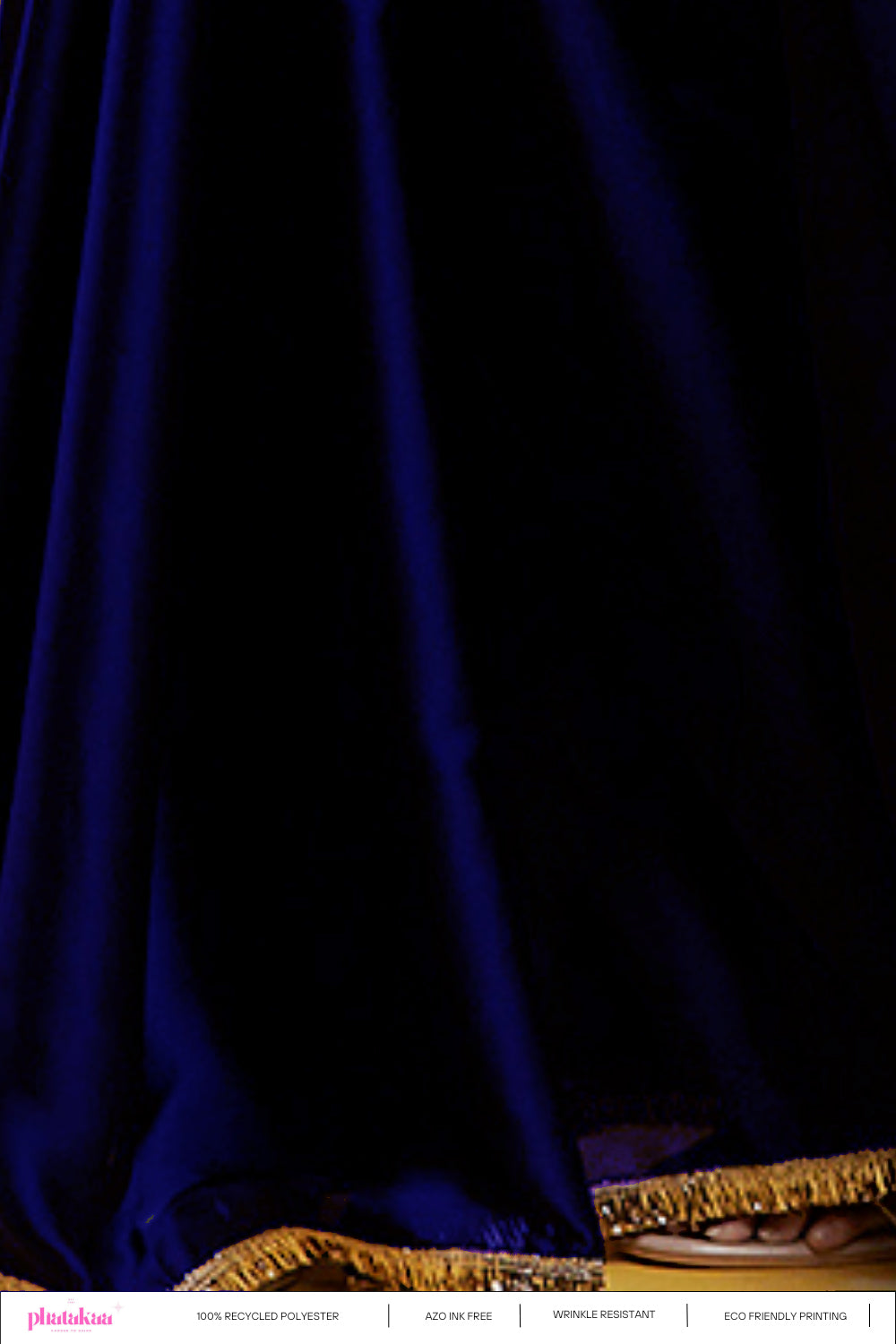 A statement Saree with an gota fringe border to give a desi vibe! Paired with our Signature foil blouse, statement neck piece, stud earrings and comfortable heels. Featuring a V-neck foil printed blouse in a 100% recycled polyester base.