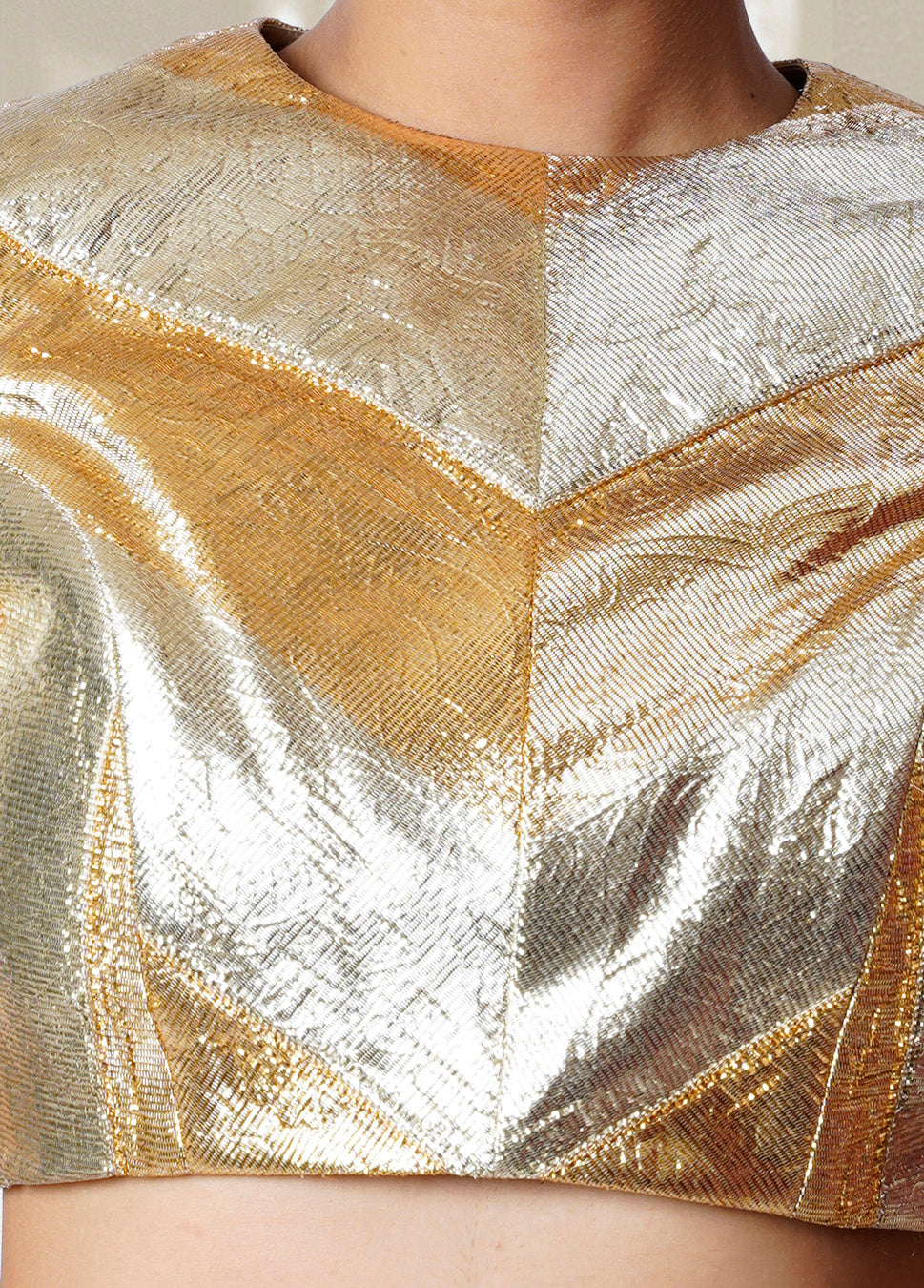 A cropped yet subtle blouse with a structured round neckline and elbow length sleeves, secured with a back metal zip is perfect for your desi festive season.