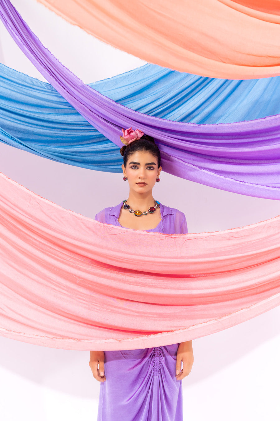 A sophisticated ensemble featuring a sheer purple organza waistcoat adorned with delicate appliqué floral motifs, adding a soft, feminine charm. Layered over a fluid satin chiffon inner, the look is completed with a modal satin cinched skirt that enhances the silhouette with graceful structure. This outfit effortlessly blends elegance and modernity—perfect for contemporary festive wear, soirées, or refined day events.