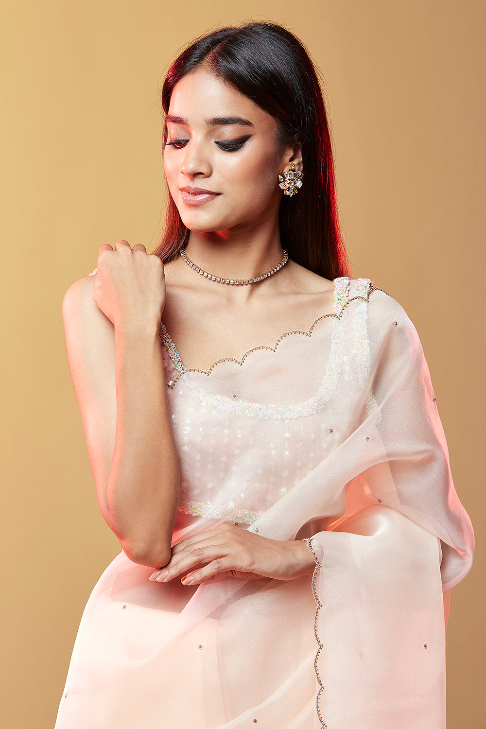 A organza saree with a carefully hand embroidered white, iridescent, and silver sequins in a flattering scallop pattern border. Wear it with our Front tie-up crop for a glitzy co-ord look. Shown here in Blush. Top sold seperately. This product is Handmade.