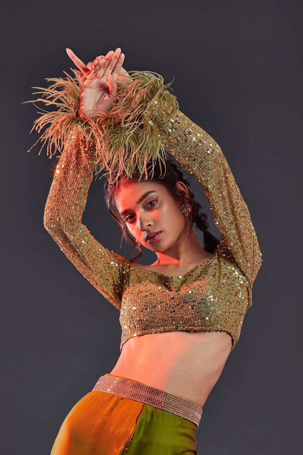 All eyes are on you in our Sirena Set. This square neck crop top style features a feather details sleeve and a backtie up detail. Turn up the heat when you pair it with our Flared pants and Belt. Wear it with our Magda Crystal Belt for a shimmery co-ord look. Belt sold seperately.