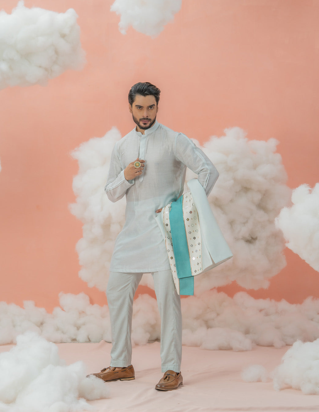 This is a blue silk long kurta set paired with the Sparkle Sangeet bundi makes it a glistening pairing for your festivals, poojas, functions, etc. The flickering embroidery combined with colorblocked shades of blue adds a touch of vibrance in the look.