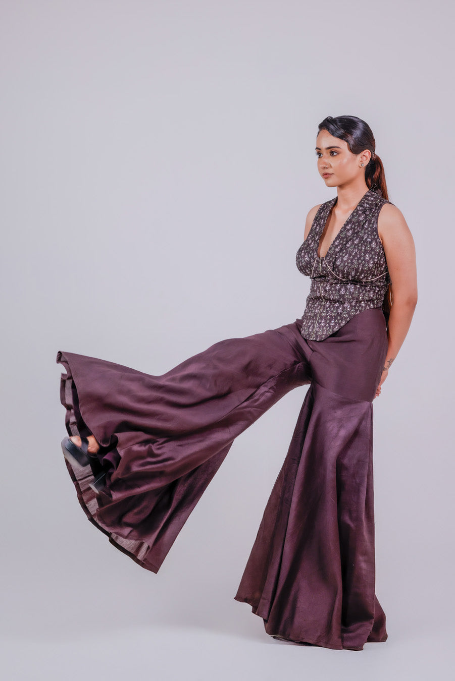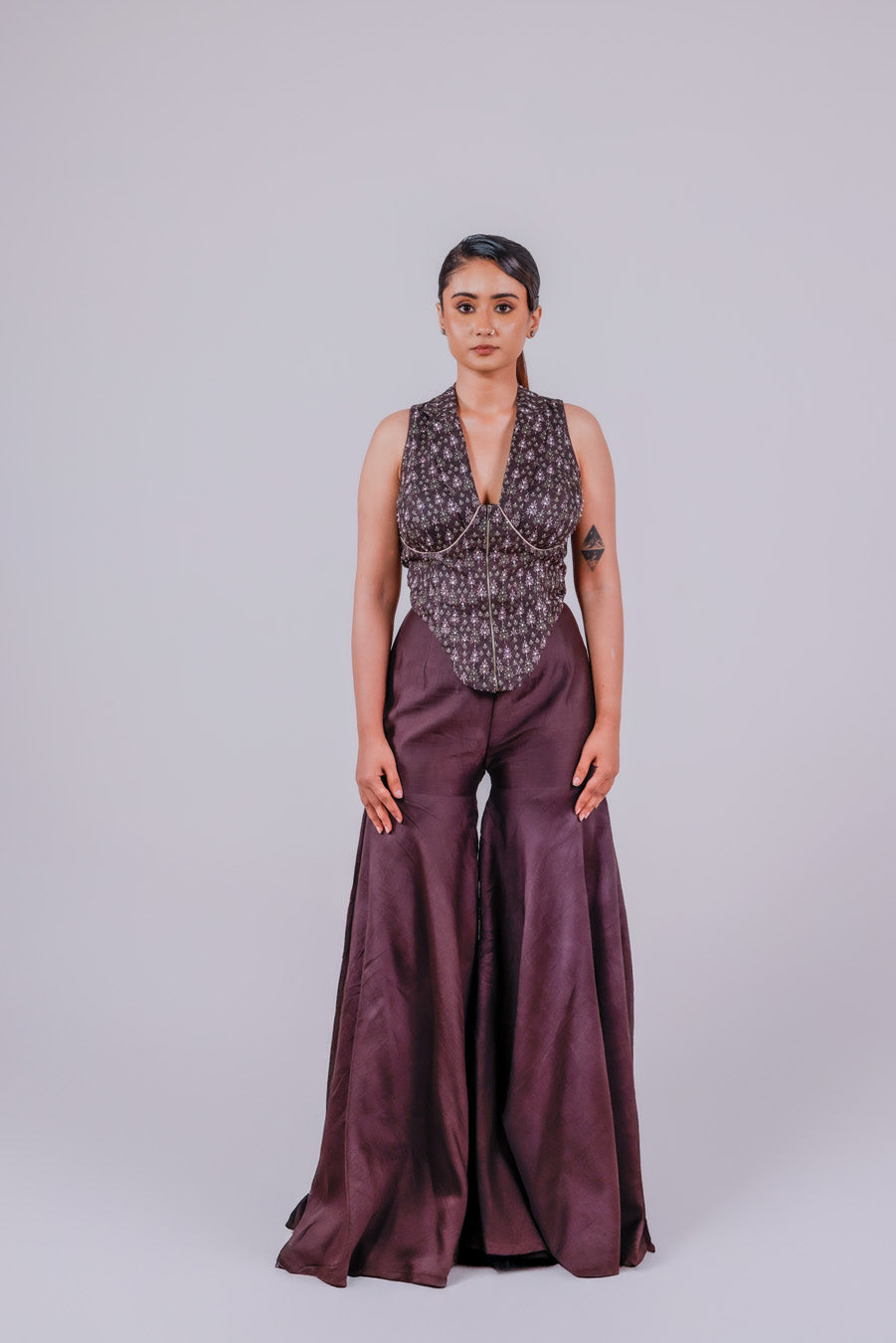 Blending power dressing with Indian prints, this corset-blazer hybrid comes adorned with sequins, beads, and a metallic zipper. The high-waisted chanderi draped pants feature side box pleats—equal parts comfort and statement.