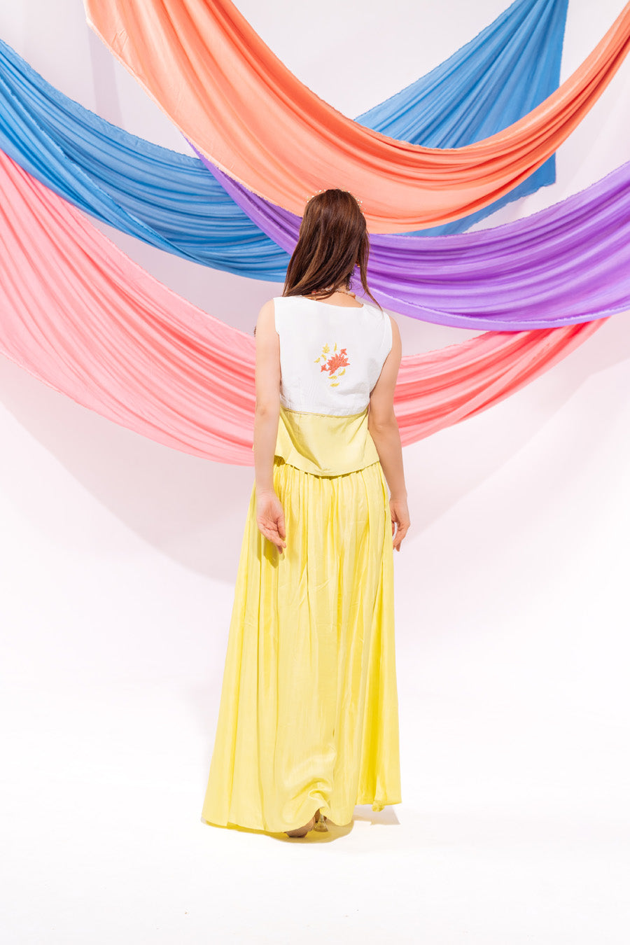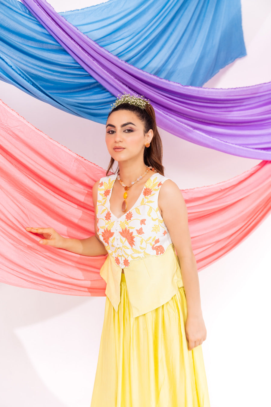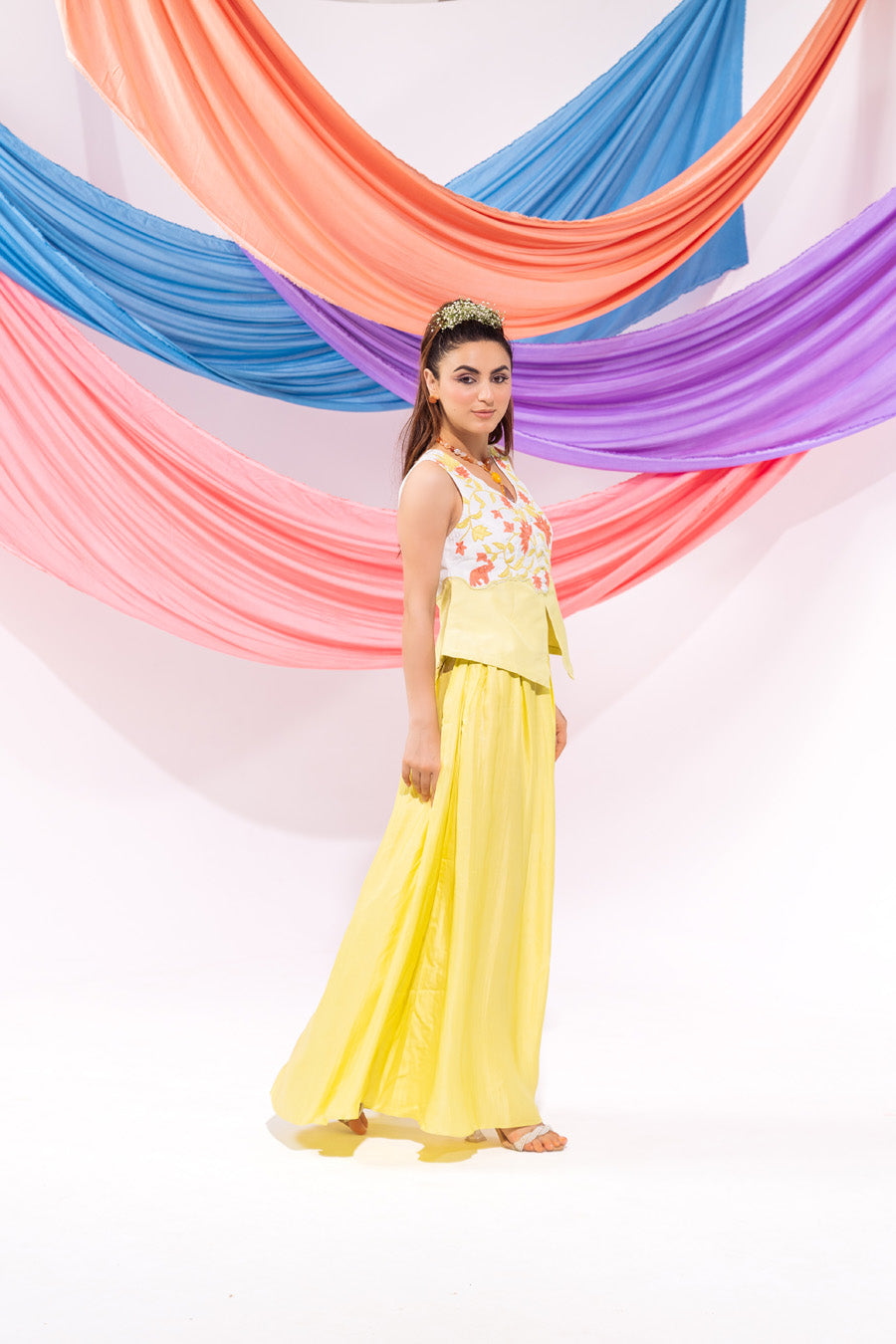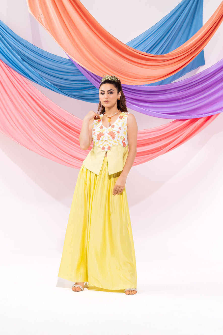 A striking white and lime green cut-waistcoat featuring elevated embroidery that adds structure and artisanal detail to the silhouette. Paired with a flowing lime green skirt in a subtle linen satin blend, the look offers a perfect balance of tailored edge and graceful fluidity. This ensemble is a bold yet elegant statement—ideal for modern festive wear or elevated daytime occasions.